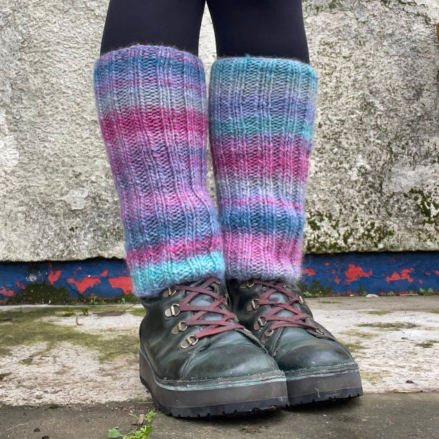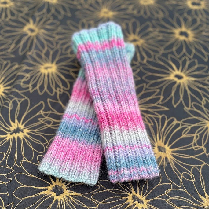 They are straight and measure approx 33cm (13"), and are made using a super soft chunky wool blend consisting of a lovely hue of pinks, blues, and light purple.