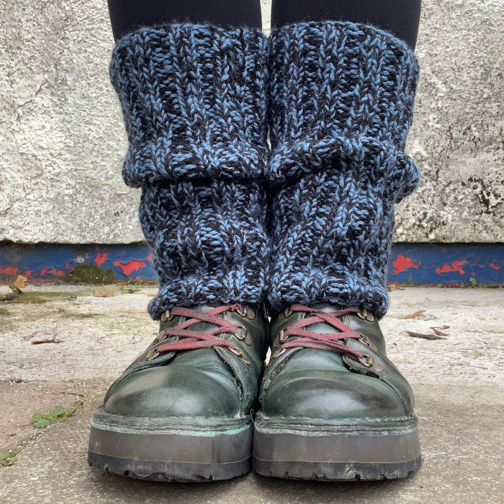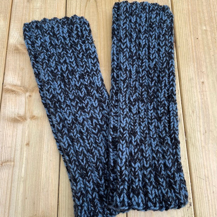 They are straight and measure approx 33cm (13"), and are knitted using two different yarns. A narrow band of metallic fibre runs through, giving them a bit of shimmer. The leg warmers are 97.5% acrylic and 2.5% lurex.
